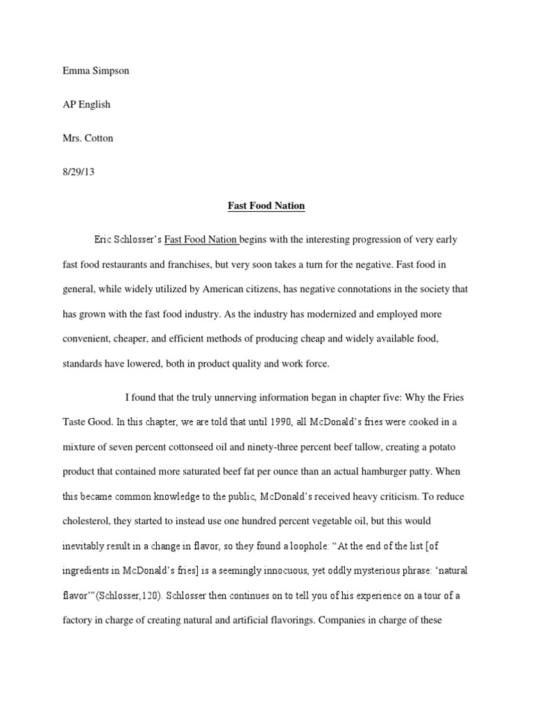 Outline I Introduction: Fast Essay on fast food nation Nation is a book in which Eric Schlosser did not hold any detail back. His ideas are very much similar to Hank Cardello who expressed his feelings in his best seller Stuffed and a article labeled Bacon as a Weapon of Mass Destruction. All of these topics touch upon the problem of obesity, low wages, and unethical issues. II Topic Sentence 1: Obesity was on of the most talked about issues within all the texts. IV Topic Sentence 3: McDonalds does tell the consumer all the ingredients which go into their food. V} If we continue to eat away our lives from these essay on fast food nation food joints, our country might become one of the most unhealthiest places to settle.